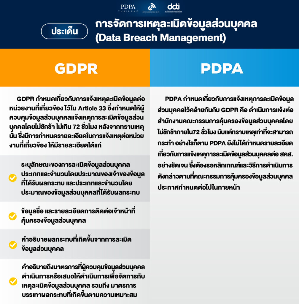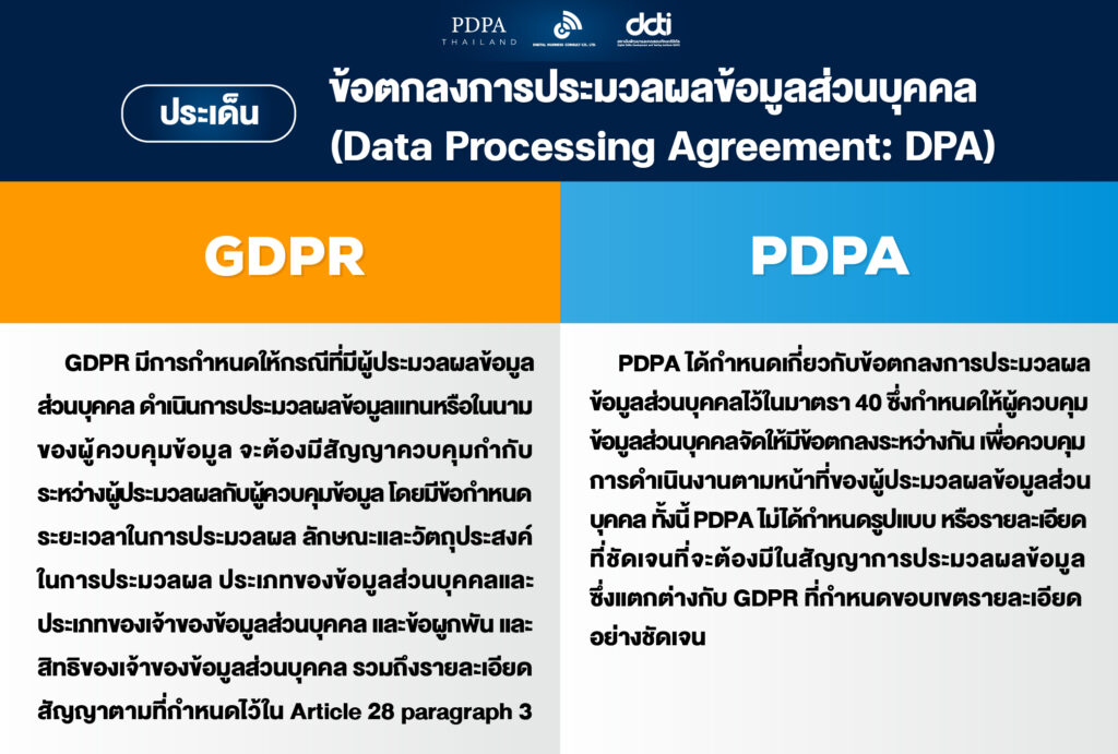 ข้อมูลตารางการเปรียบเทียบในประเด็นต่าง ๆ ข้างต้น สรุปได้ว่า หากองค์กรต้องการที่จะนำแนวทางที่กำหนดไว้ตาม GDPR มาปรับใช้ก็สามารถกระทำได้ แต่จะต้องพิจารณาดำเนินการให้สอดคล้องกับที่ PDPA กำหนดเป็นสำคัญ เพราะพระราชบัญญัติคุ้มครองข้อมูลส่วนบุคคล (PDPA) นั้นใช้บังคับแก่การเก็บรวบรวม ใช้ หรือเปิดเผยข้อมูลส่วนบุคคลโดยผู้ควบคุมข้อมูลส่วนบุคคลหรือผู้ประมวลผลข้อมูลส่วนบุคคลซึ่งอยู่ในราชอาณาจักรไทย ไม่ว่าการเก็บรวบรวม ใช้ หรือเปิดเผยนั้น ได้กระทำในหรือนอกราชอาณาจักรก็ตาม ดังนั้น หากกิจการตั้งอยู่ในประเทศไทย ย่อมไม่สามารถหลีกเลี่ยงในการปฏิบัติตาม PDPA ได้