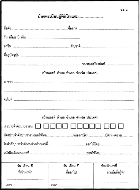 สำหรับเอกสาร ร.ร.3 หรือ บัตรทะเบียนผู้พักโรงแรม เป็นเอกสารที่กรมการปกครองกำหนดให้โรงแรมต้องจัดให้มีการบันทึกรายการต่างๆ เกี่ยวกับผู้พักและจํานวนผู้พักในแต่ละห้องทันทีที่มีการเข้าพัก โดยให้ผู้พักคนใดคนหนึ่งเป็นผู้ลงลายมือชื่อในบัตรทะเบียนผู้พัก หากผู้พักมีอายุต่ำกว่า 18 ปีบริบูรณ์และเข้าพักตามลําพัง ให้ผู้จัดการหรือผู้แทนลงลายมือชื่อกํากับไว้และ