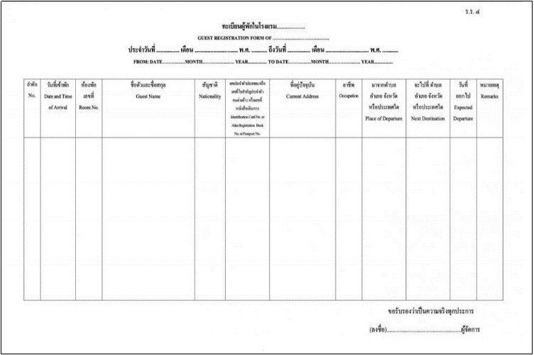 โรงแรมต้องนําไปบันทึกลงในทะเบียนผู้พัก (ร.ร.4) ให้แล้วเสร็จภายใน 24 ชั่วโมงหลังจากมีการลงทะเบียนเข้าพัก