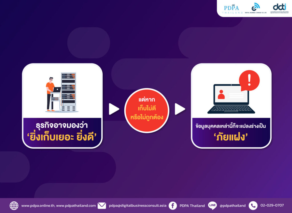 ในเมื่อมีกฎหมายคุ้มครองข้อมูลส่วนบุคคล ก็หมายความได้โดยตรงว่า เจ้าของข้อมูลมีสิทธิในการอนุญาตให้เปิดเผย แก้ไข ระงับ หรือแม้แต่ไม่ยินยอมให้เปิดเผยข้อมูลก็ได้ ขณะเดียวกันทางด้านธุรกิจที่แต่เดิม ได้มีการจัดเก็บข้อมูลลูกค้า/คู่ค้า ข้อมูลพนักงาน ของมูลลูกจ้างภายนอก ซึ่งข้อมูลต่างๆ เหล่านี้ แต่เดิมธุรกิจอาจมองว่า ‘ยิ่งเก็บเยอะ ยิ่งดี’ แต่หากเก็บไม่ดี หรือไม่ถูกต้อง ข้อมูลบุคคลเหล่านี้ก็จะแปลงร่างเป็น ‘ภัยแฝง’