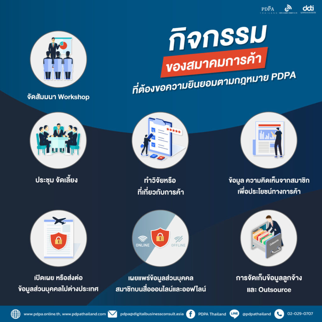 ** ข้อสังเกต จากกิจกรรมในข้างข้างต้น สมาคมการค้า อาจระบุว่าเป็นการดำเนินการโดยชอบด้วยกฎหมาย หรือกิจกรรมเพื่อประโยชน์ต่อสาธารณะที่อาจมีการเก็บ ใช้หรือเปิดเผยข้อมูลส่วนบุคคลได้แม้ได้ได้ขอความยินยอม แต่ก็ยังอยู่บนเงื่อนไขที่ว่าจะต้องจัดทำภายใต้มาตรการคุ้มครองข้อมูลส่วนบุคคลอย่างเหมาะสม