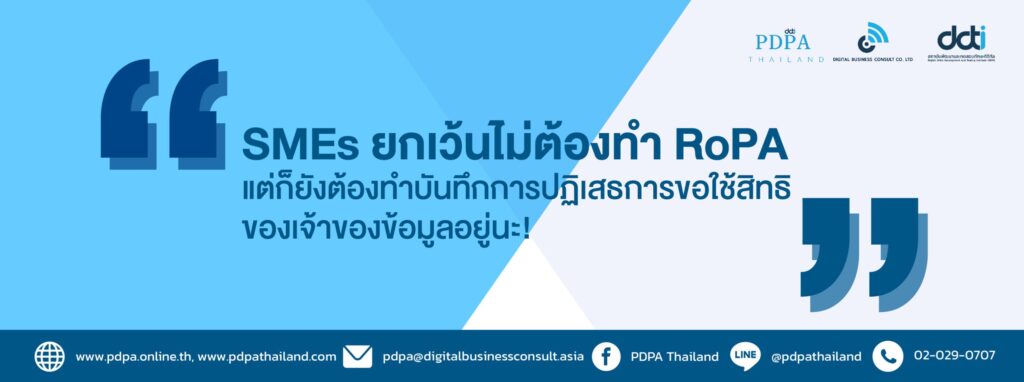 ทั้งนี้เราจะเห็นหลักการปฏิบัติสำหรับชาว SME มากมายที่จำเป็นต้องทำเพื่อให้ธุรกิจสอดคล้องกับ พ.ร.บ. คุ้มครองข้อมูลส่วนบุคคล หรือ กฎหมาย PDPA …ล่าสุด! เมื่อวันที่ 20 มิถุนายน 2565 ได้มีประกาศจากคณะกรรมการคุ้มครองข้อมูลส่วนบุคคล โดยใช้ชื่อว่า “ประกาศคณะกรรมการคุ้มครองข้อมูลส่วนบุคคล เรื่องการยกเว้นการบันทึกรายการของผู้ควบคุมข้อมูลส่วนบุคคลซึ่งเป็นกิจการขนาดเล็ก พ.ศ. 2565” มีกำหนดการให้ใช้บังคับตั้งแต่วันถัดจากวันประกาศเป็นต้นไป โดยธุรกิจขนาดเล็ก ถึงกลาง หรือSMEs ได้รับการยกเว้นไม่ต้องดำเนินการทำ ‘บันทึกรายการของกิจกรรมการประมวลผลข้อมูลส่วนบุคคล (Records of Processing Activity: RoPA)’