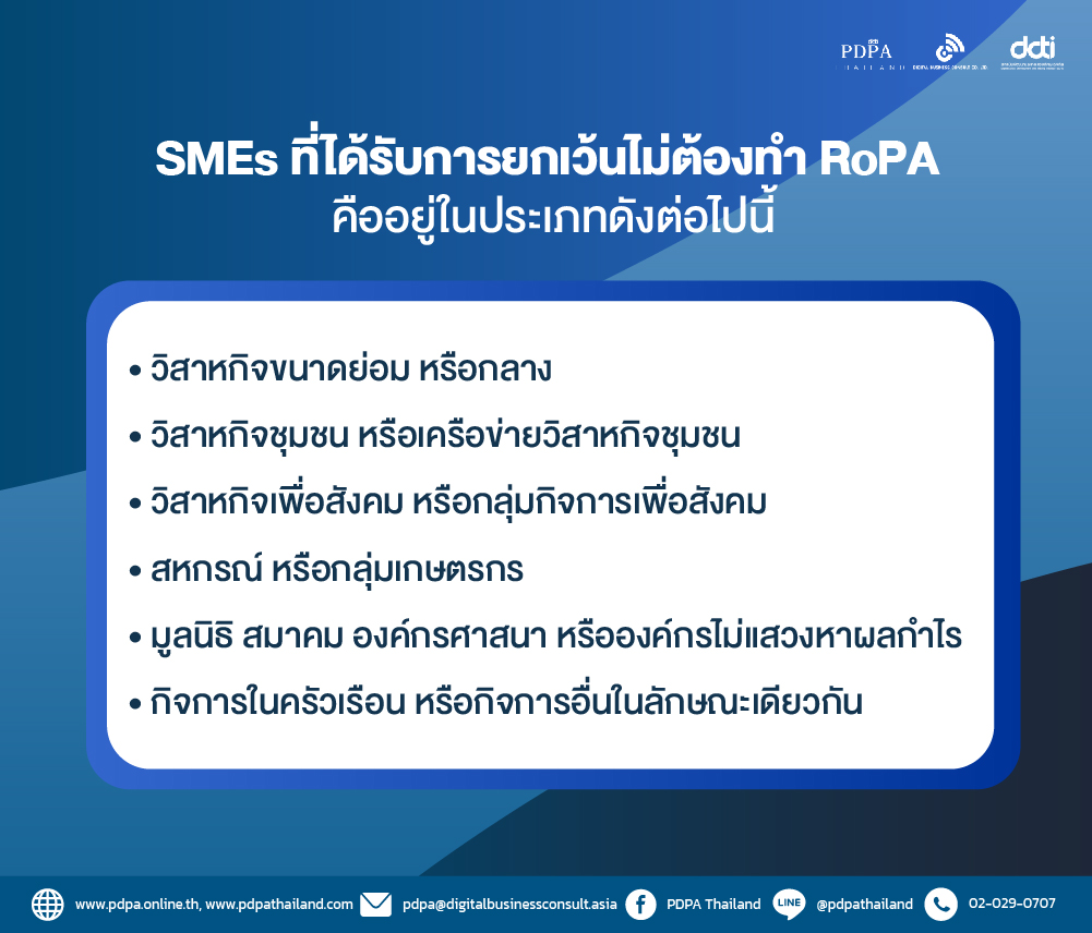 ซึ่งจาก ประกาศคณะกรรมการคุ้มครองข้อมูลส่วนบุคคล เรื่องการยกเว้นการบันทึกรายการของผู้ควบคุมข้อมูลส่วนบุคคลซึ่งเป็นกิจการขนาดเล็ก พ.ศ. 2565มีกำหนดการให้SMEs ที่ได้รับการยกเว้นไม่ต้องทำ RoPA คืออยู่ในประเภทดังต่อไปนี้