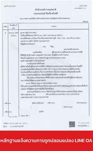 ภาพที่ 3: หลักฐานแจ้งความการถูกปลอมแปลง LINE OA