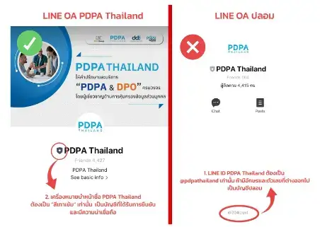 จุดสังเกตบัญชีทางการของ PDPA Thailand ได้แก่ LINE ID จะใช้ชื่อ @PDPATHAILAND มีสัญลักษณ์โล่สีเทาเข้มซึ่งปรากฏหน้าชื่อ LINE OA ของบัญชีร้านค้าที่ผ่านการรับรองแล้วเท่านั้น ส่วนบัญชีปลอมจะใช้รหัสอักษรและตัวเลขที่ต่างออกไปจากนี้ จึงขอให้ลูกค้าและผู้ติดต่อกรุณาอย่าหลงเชื่อการแอบอ้างจากช่องทางอื่น ๆ ที่ไม่ใช่ช่องทางทางการของ PDPA Thailand